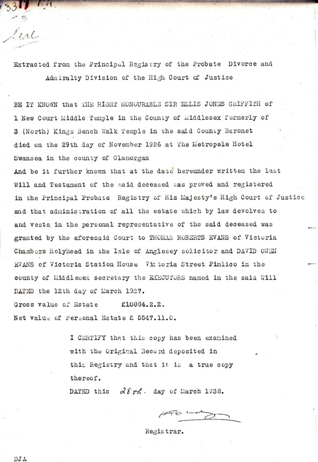 Sir Ellis Jones Ellis-Griffith Last Will and Testament and Probate To view this document as a pdf click here To view this document as a pdf click here Share this: Click to share on X (Opens in new window) X Click to share on Facebook (Opens in new window) Facebook Like Loading... Related